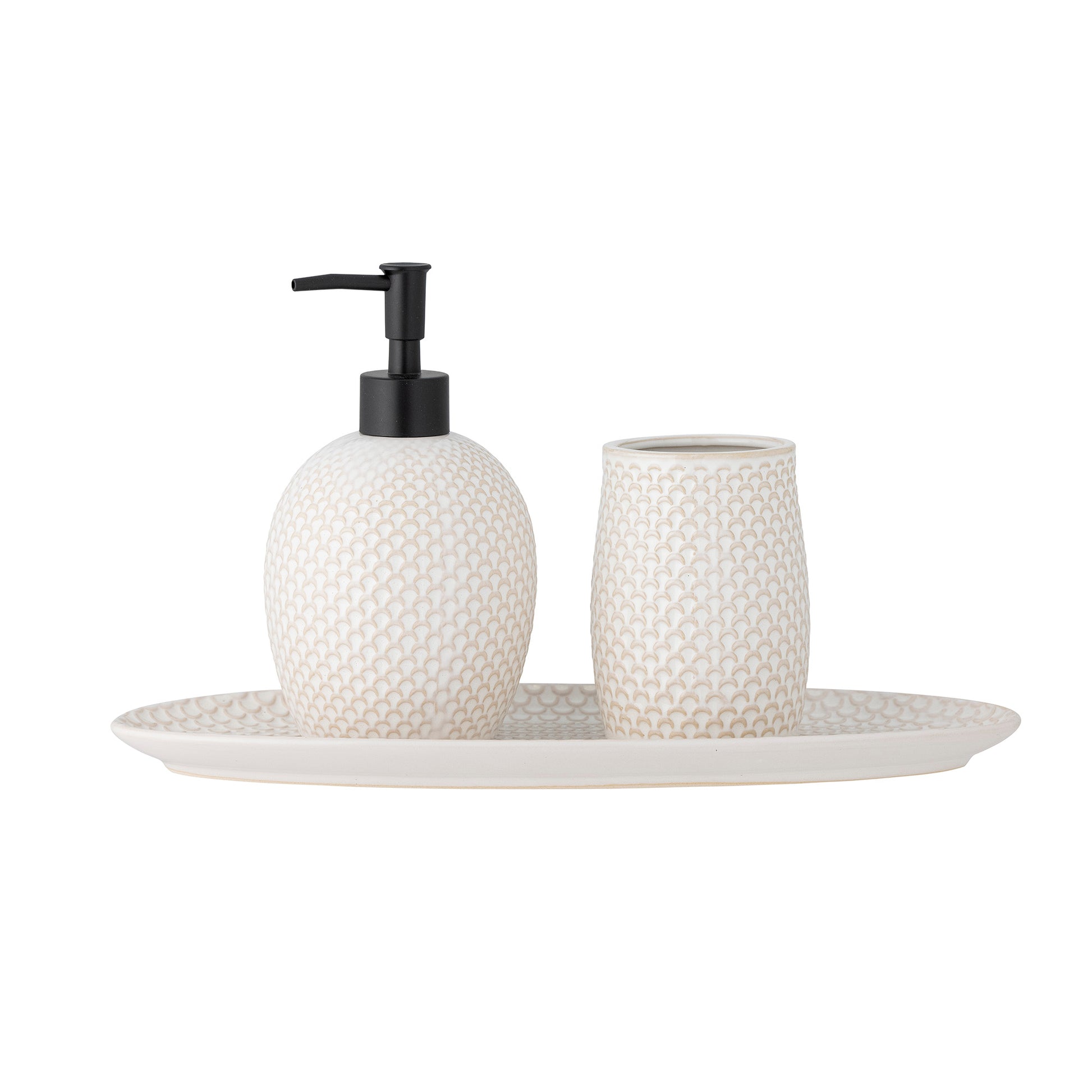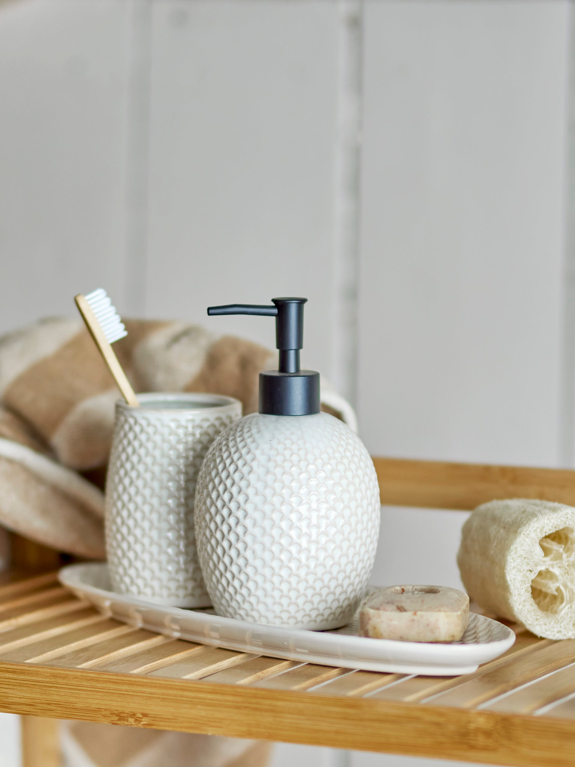 Das Seifenspenderset Hrin von Bloomingville nimmt sich mit seinen natürlichen Farbtönen in jedem Badezimmer gut aus. Aufgrund der Natur der Glasur sowie der handgefertigten Technik können Farbvariationen vorkommen.